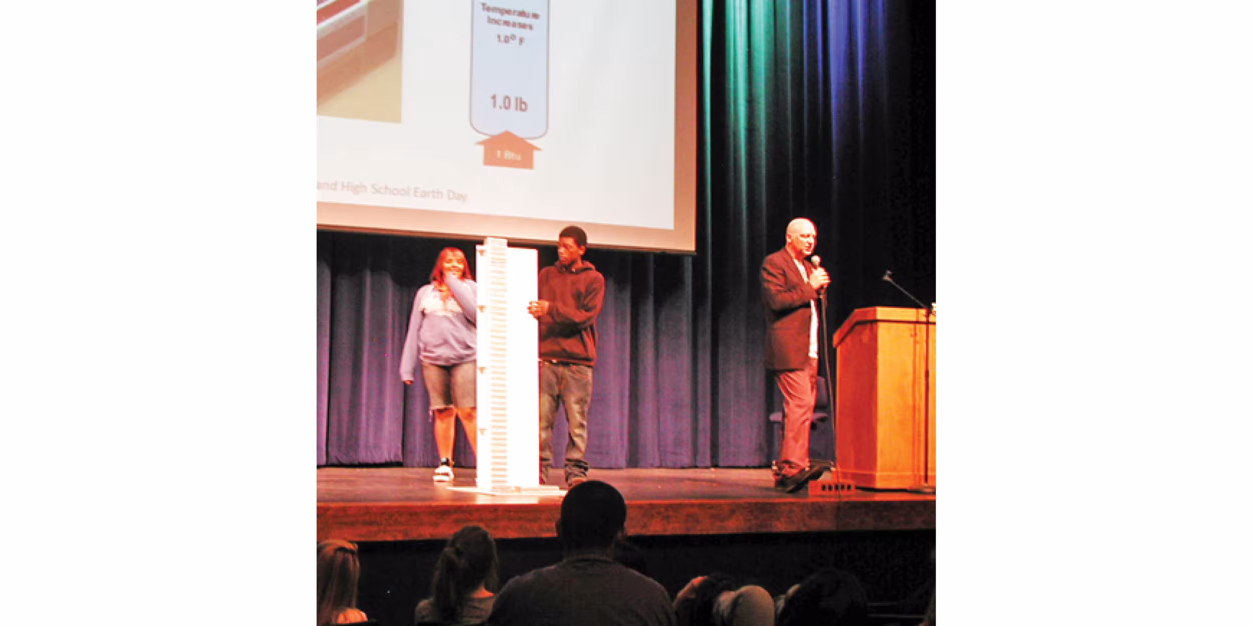 The first school was a middle school and the presentation was held in their gymnasium, as that was the only space large enough to hold their 1,400 students. The presentation covered a brief history of Earth Day and career opportunities related to the environment. We then moved to the high school where we had student volunteers help us demonstrate energy use intensity on the stage. Our use of thousands of matches to illustrate kBtu’s increased both risk and audience enthusiasm. There is nothing like a potential disaster to get students’ attention!