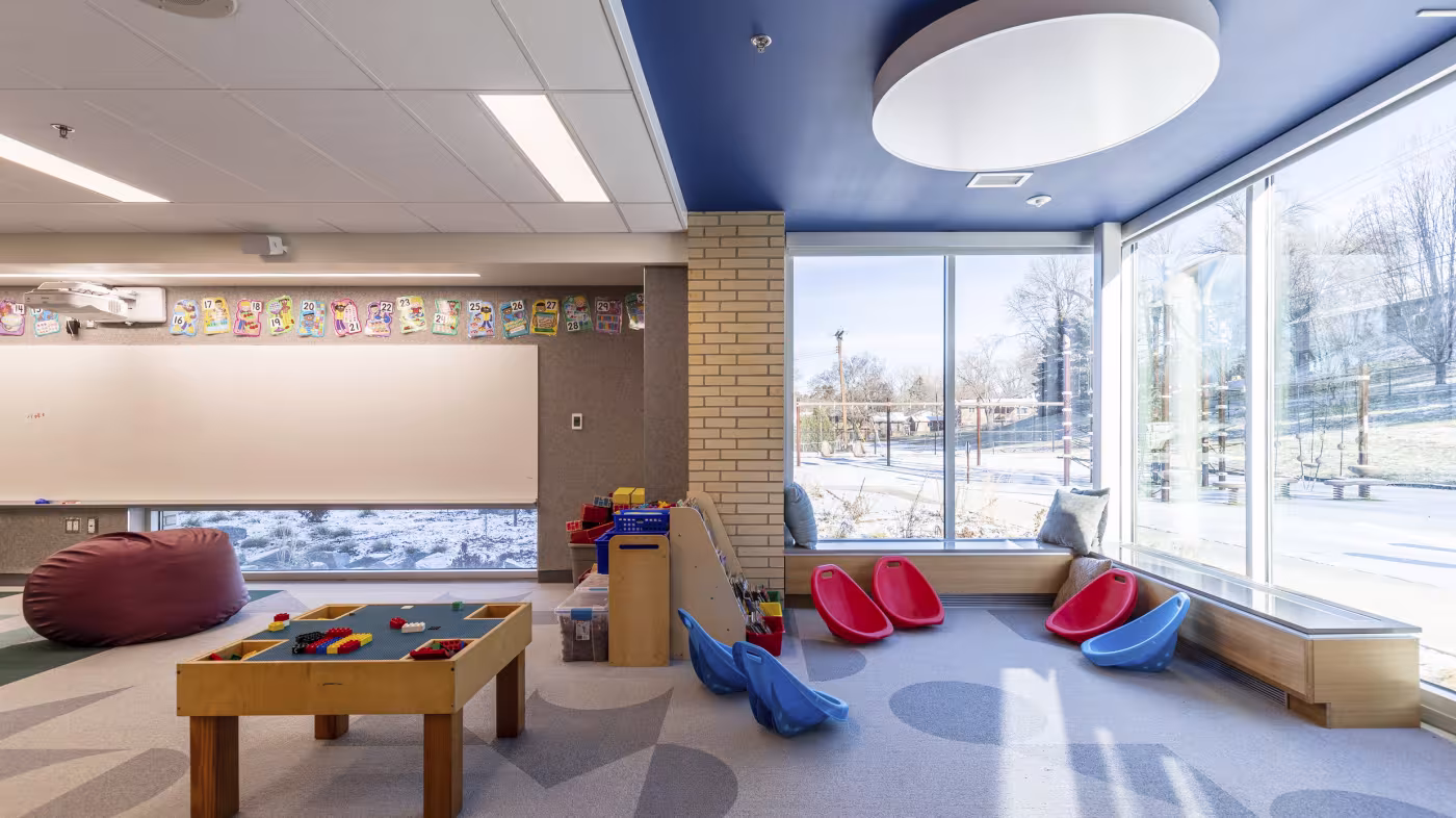 The new learning studios look out onto the play area to connect indoor-outdoor learning. Since younger students tend to spend a lot of time on the floor, low slot windows were incorporated to bring in natural daylight and provide students opportunities greater personal engagement with the adjacent rain gardens on a daily basis.