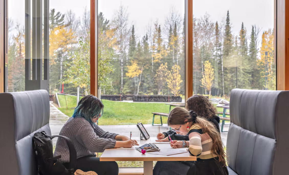 In addition to the difficulty of being constructed on geological faults and folds of the Laurentian Divide, the design and construction team collaborated with Rock Ridge Public Schools to develop on-site construction training opportunities for students. As a result, students were involved in the construction of 15 small structures throughout campus, such as dugouts, decks, and storage buildings. The district also partnered with local businesses during the construction process to give students exposure to a variety of career opportunities.
