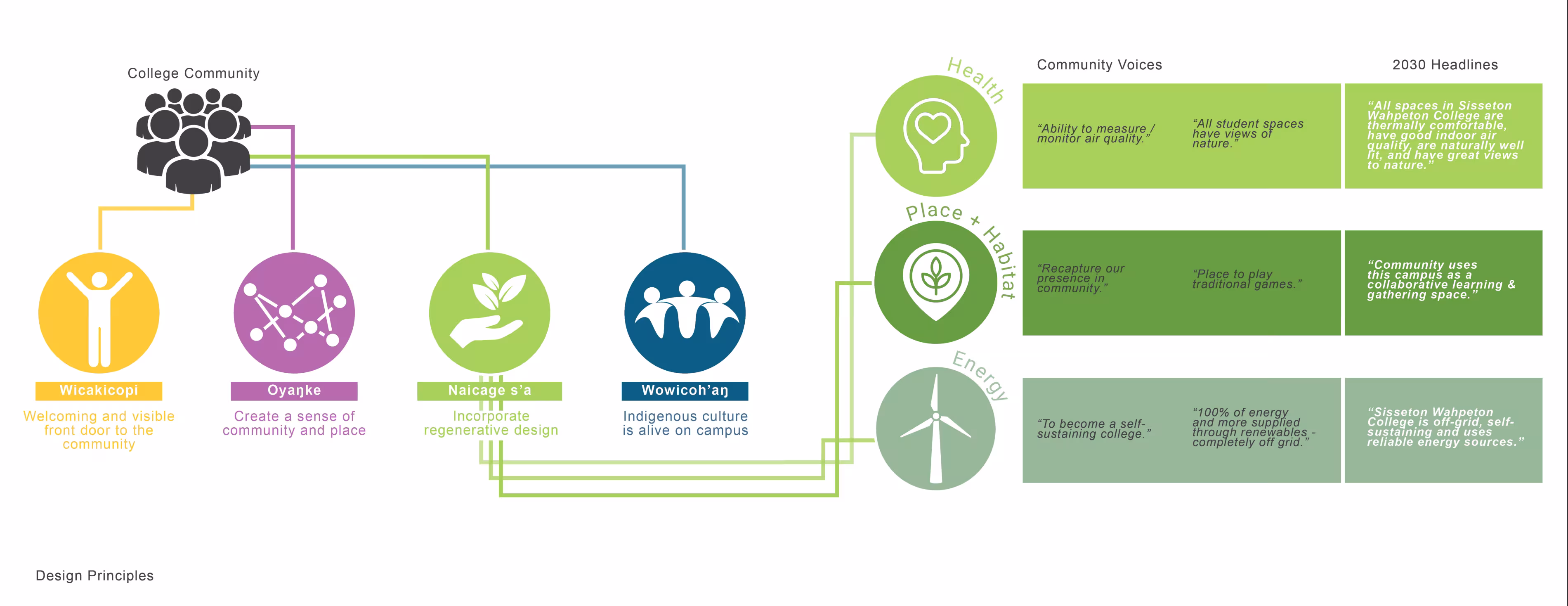 Witnessing the effects of climate change on the region and its disproportionate toll on many indigenous communities, South Dakota’s Sisseton Wahpeton Oyate members of the Lake Traverse Reservation worked with Cuningham to create for their school — Sisseton Wahpeton College — a resiliency plan focused on health and wellness, place and habitat, and an off-grid sustainable campus that thrives as its community moves toward the future.