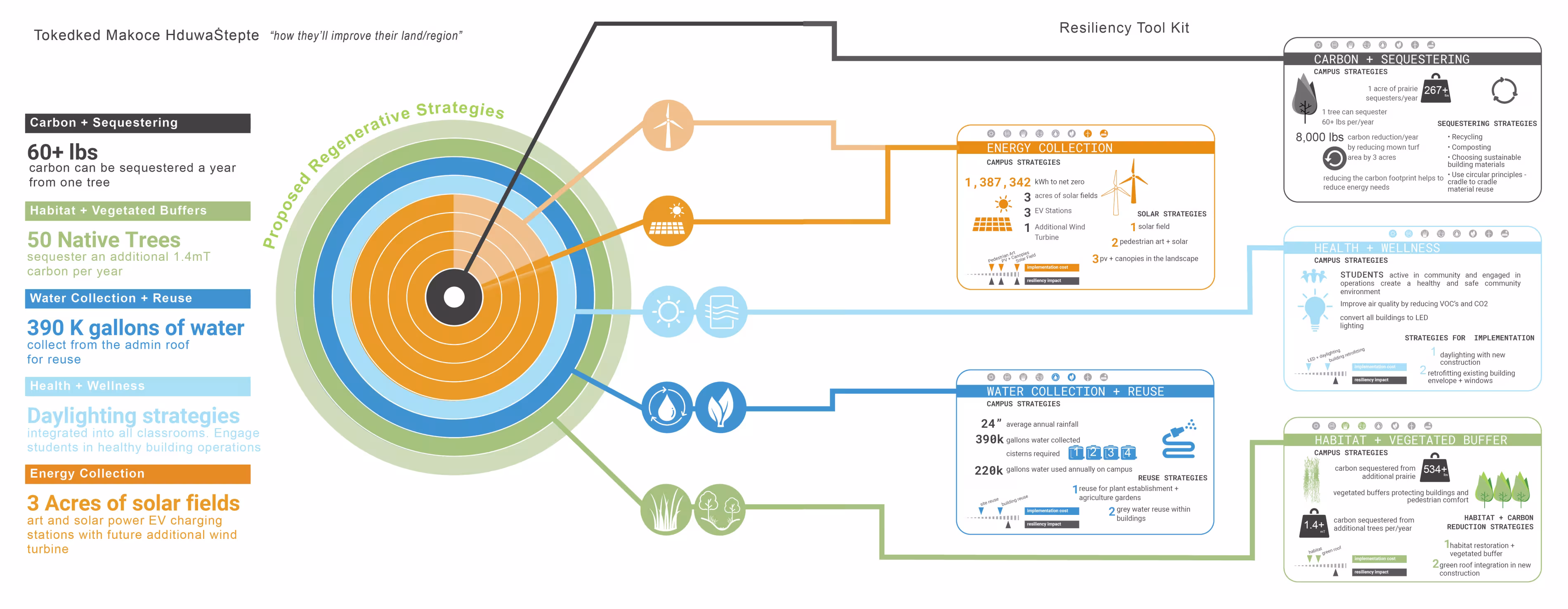 The resiliency plan focuses on environmental strategies that guide the campus’ future toward climate neutrality and positively impact the regional environment. Health, place, habitat, and energy are the prioritized strategies, driving the creation of regenerative measures followed by the development of a resiliency tool kit ensuring implementation of such measures were understood and followed.