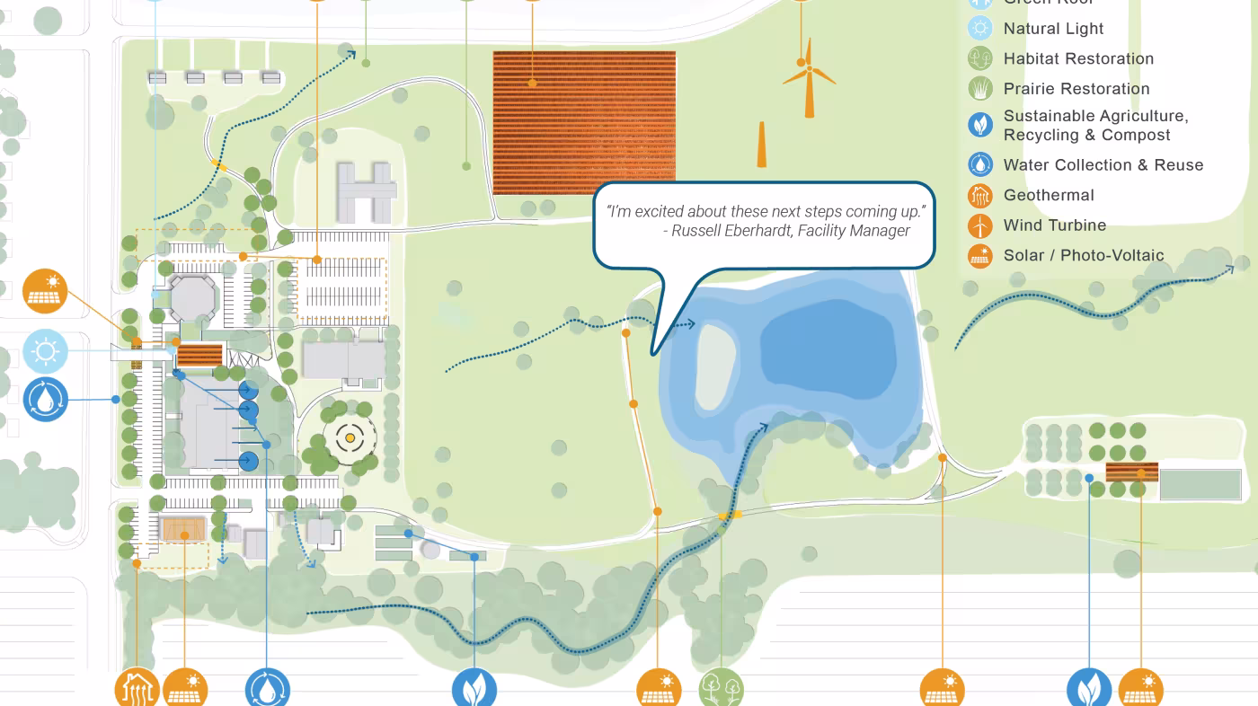 To date, the college has restored 30 acres of native prairie, incorporated wind power, geo-thermal wells serving three buildings, and minimal solar power on site. Conducting an in-depth analysis helped arrive at offsetting strategies recommended by the tool kit including: retrofitting existing structures, implementing site techniques, and reducing energy resources. Another measure included rainwater collection through cisterns. Currently, the campus uses 220,000 gallons of water annually. This could be offset by collecting rainwater from one building alone, equating to 390,000 gallons of water a year.