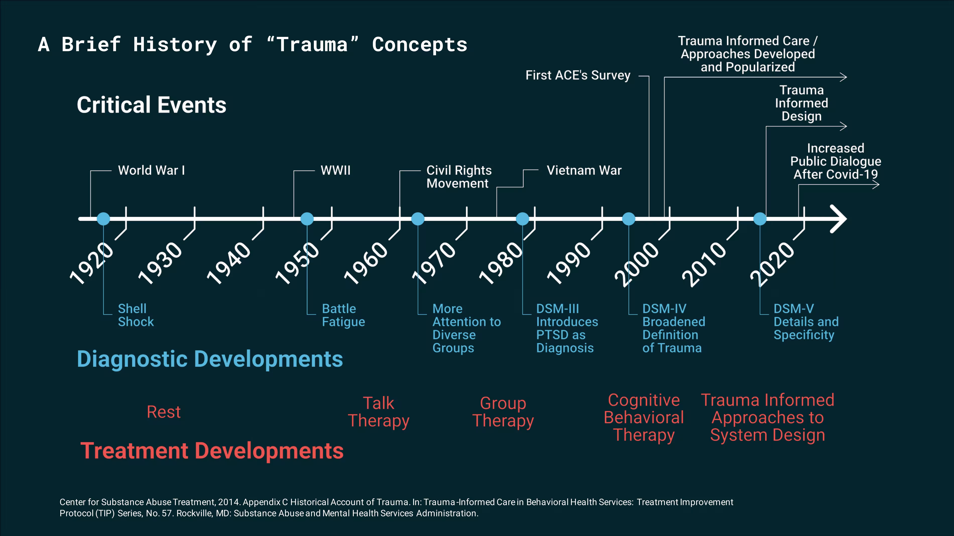 The Substance Abuse and Mental Health Services Administration (SAMHSA), an organization that provides services for individuals with mental and behavioral health challenges, recognized the importance of the ACE studies and incorporated findings into their work. Since then, SAMHSA has established themselves as one of the foremost authorities on “trauma-informed approaches” to healthcare delivery and public service programming. Their definition of trauma is one of the most referenced in the field: