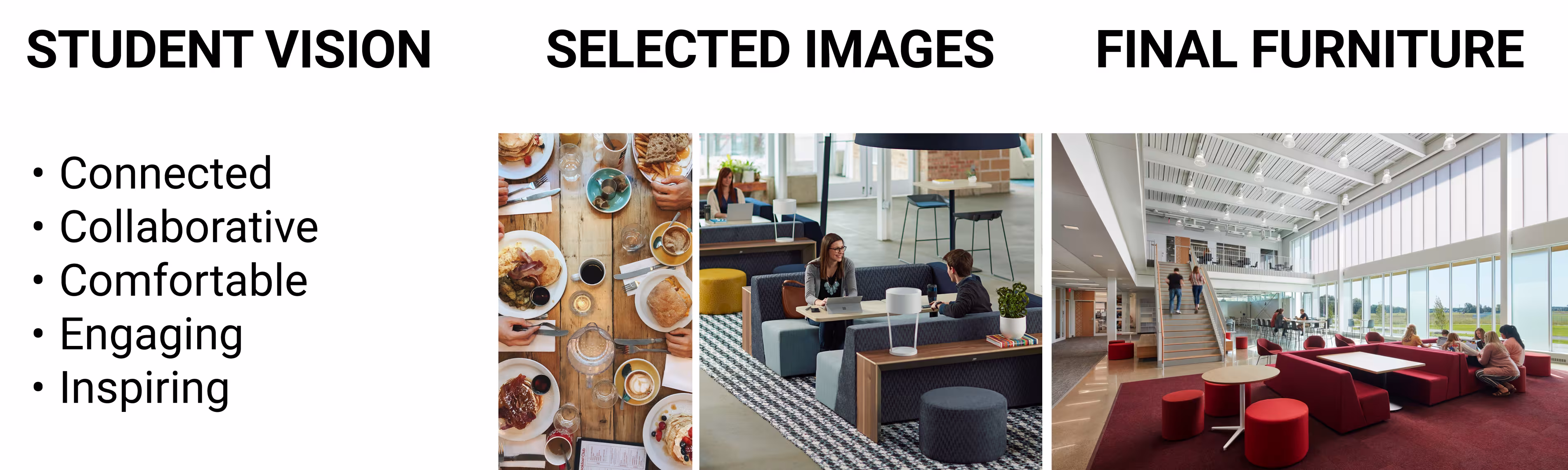 Another phase of the design process that students engaged in at Sartell High School was furniture design. A furniture kick-off workshop started by asking students to describe what they wanted their spaces to feel like by gathering words and conceptual images in a collage format. This activity was followed up with selecting images from a large image bank of specific spaces and furniture that embodied what they wanted their school to feel like. The collages completed by students during this workshop laid a foundation for the entire furniture design process, and Cuningham was able to refer back to what they created, ensuring that furniture selections aligned with their vision.