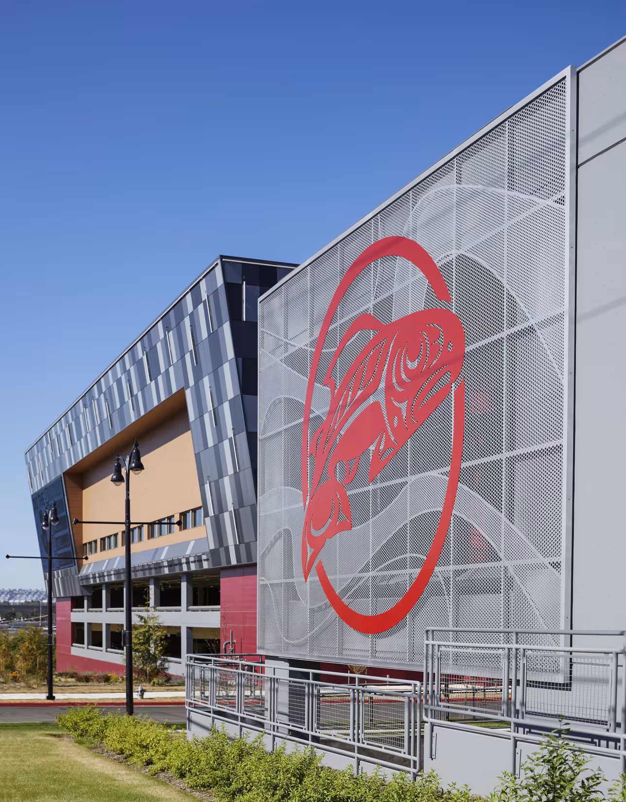 Traditional story poles, contemporary art, and the native language are woven into the design and welcome visitors into the space. With gaming on the fourth floor, the design team needed a dynamic way to direct visitors up four stories. The solution: a bold, black and white basket weave inspired exterior skin with red planes and organic textures that gives life to the interior, drawing visitors upwards to explore the vibrant, powerful, modern, and resilient tribal cultural references.