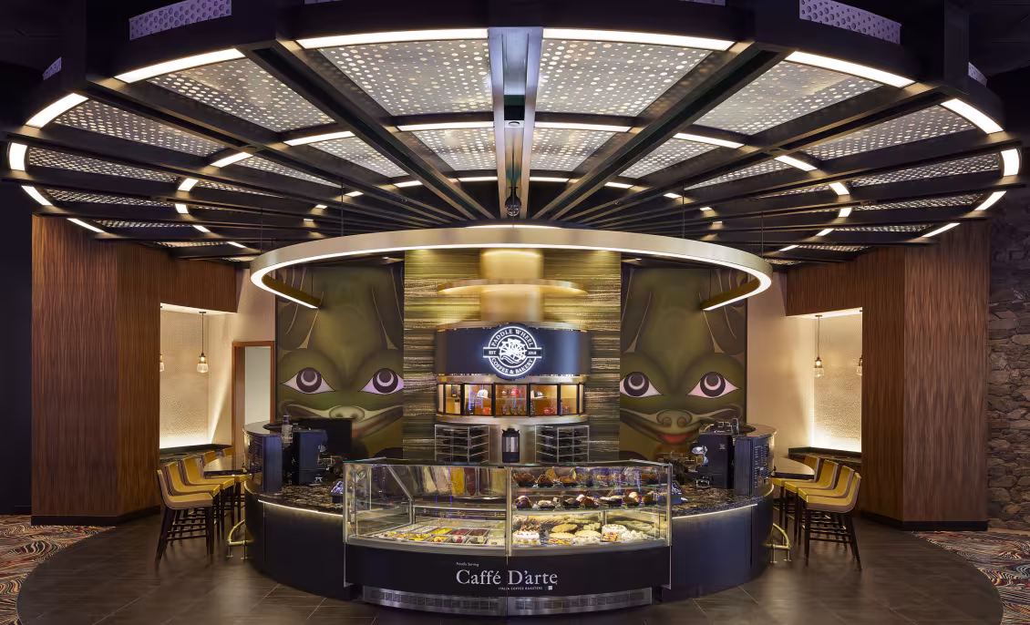 The casino also distinguishes itself by incorporating large windows and daylighting into the gaming floor, maintaining guests’ connection with nature and providing sweeping views of the surrounding area. The local mountains and waterways are important cultural landmarks for the Tribe, and interior elements subtly weave-in and draw influence from these natural elements. Inspired by riverbeds, the casino’s meandering pathways create a churning geography that flows through the space. The aubergine walls and reflective champagne columns recall backlit forests and open spaces.