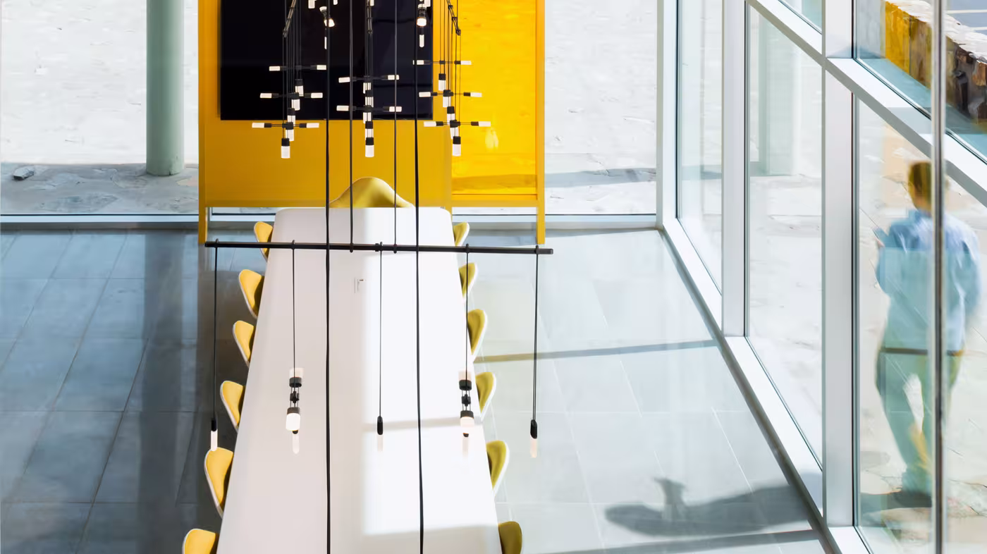 Project goals included communicating a sense of openness, hospitality and collaboration while eliminating visual barriers and employing a minimal palette of colors and materials. The result is a contemporary take on the Mid-Century Modern aesthetic.