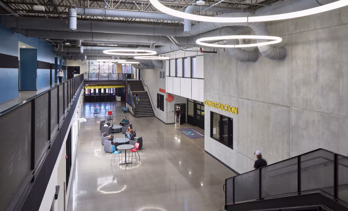 The new FutureForward at Washington Square offers both current and new CTE programs. These programs include diesel mechanics, construction trades, welding, emergency medical technician (EMT) training, criminal justice, forensic science, and fire science. The facility also includes a large central circulation / student commons area that can support flexible learning opportunities as well as larger school functions and partner events. There are multiple locations where the building systems and structure open for view, presenting students with various unique education opportunities. The building is intended to be one of the most energy efficient facilities in the district with a full geo thermal HVAC system, daylighting supported with all LED lighting, and a high performance building envelope. Not only is FutureForward at Washington Square designed for immediate use, it also has an eye toward the future.