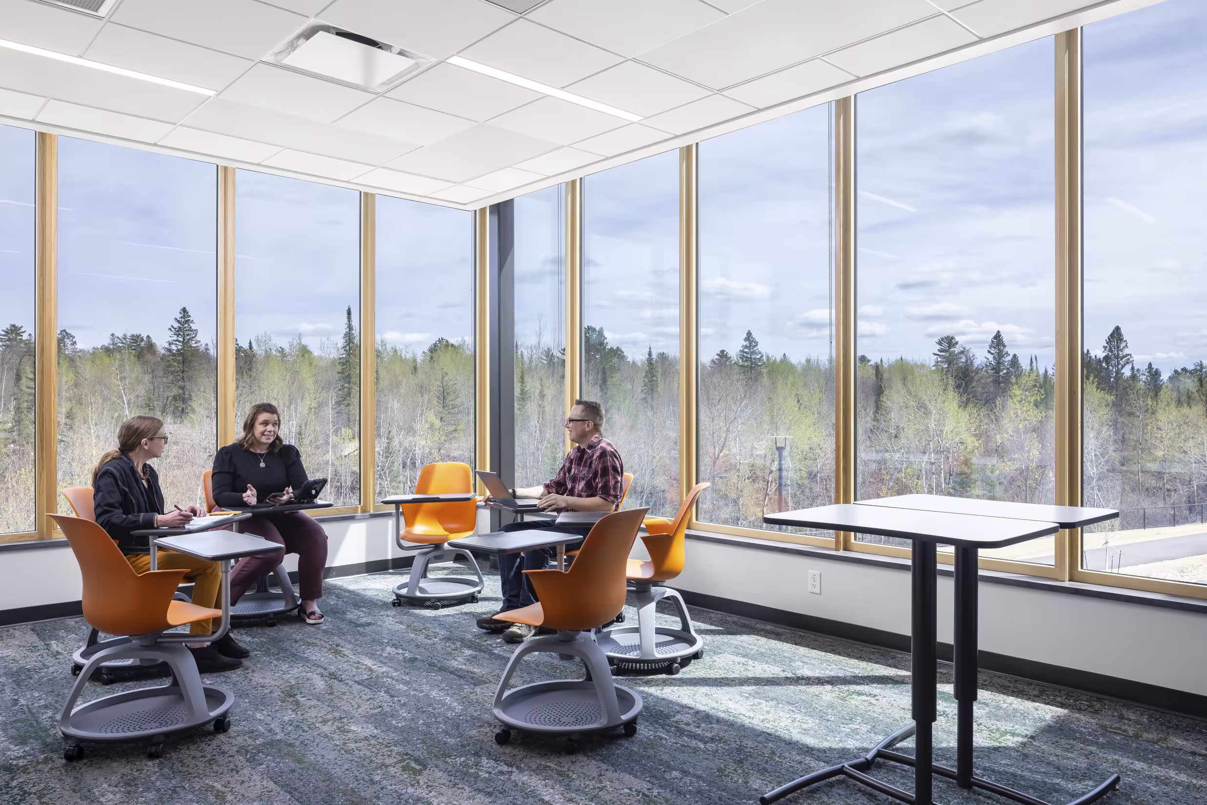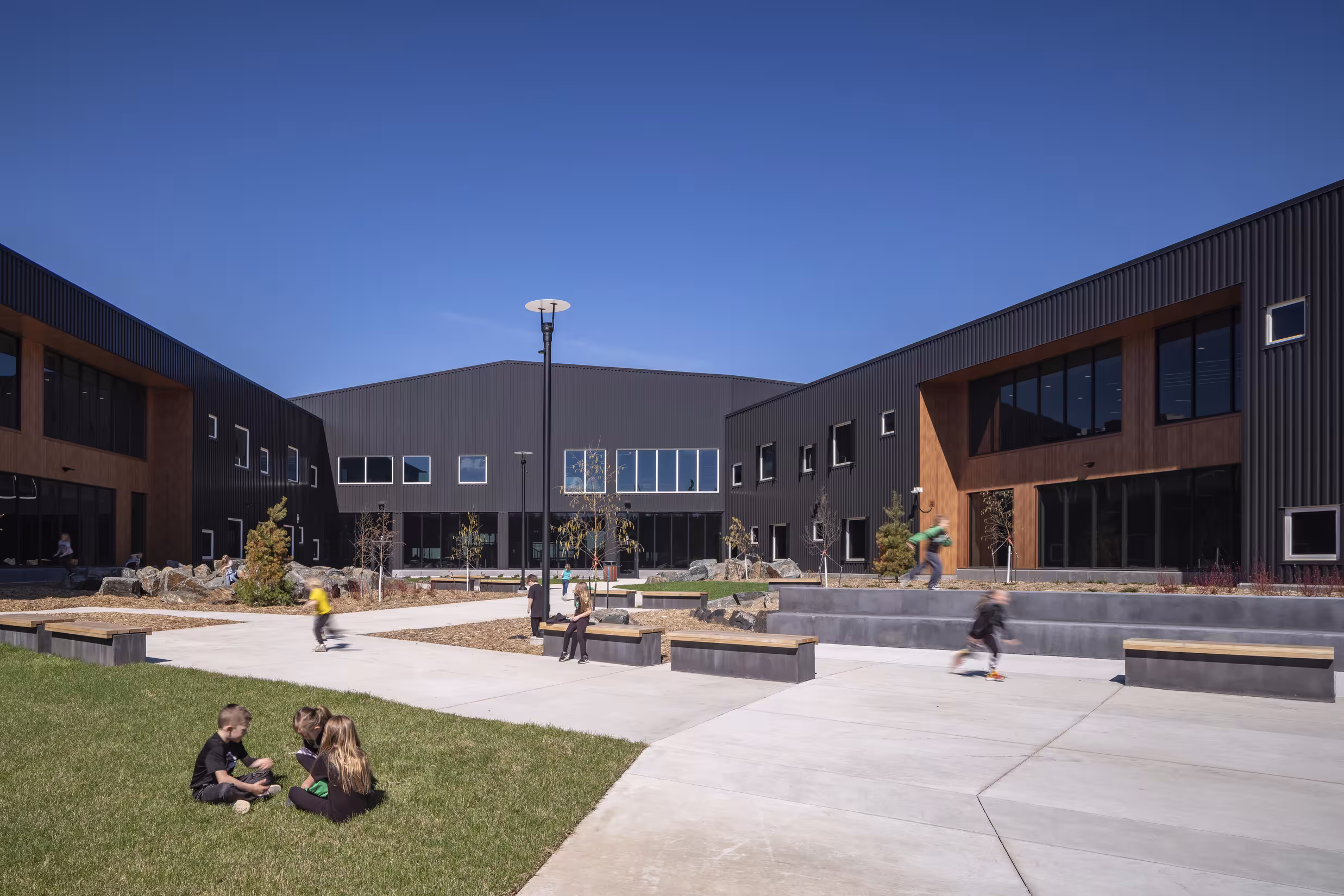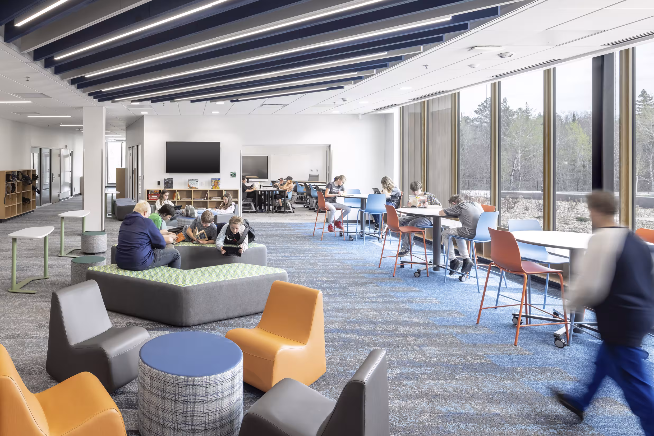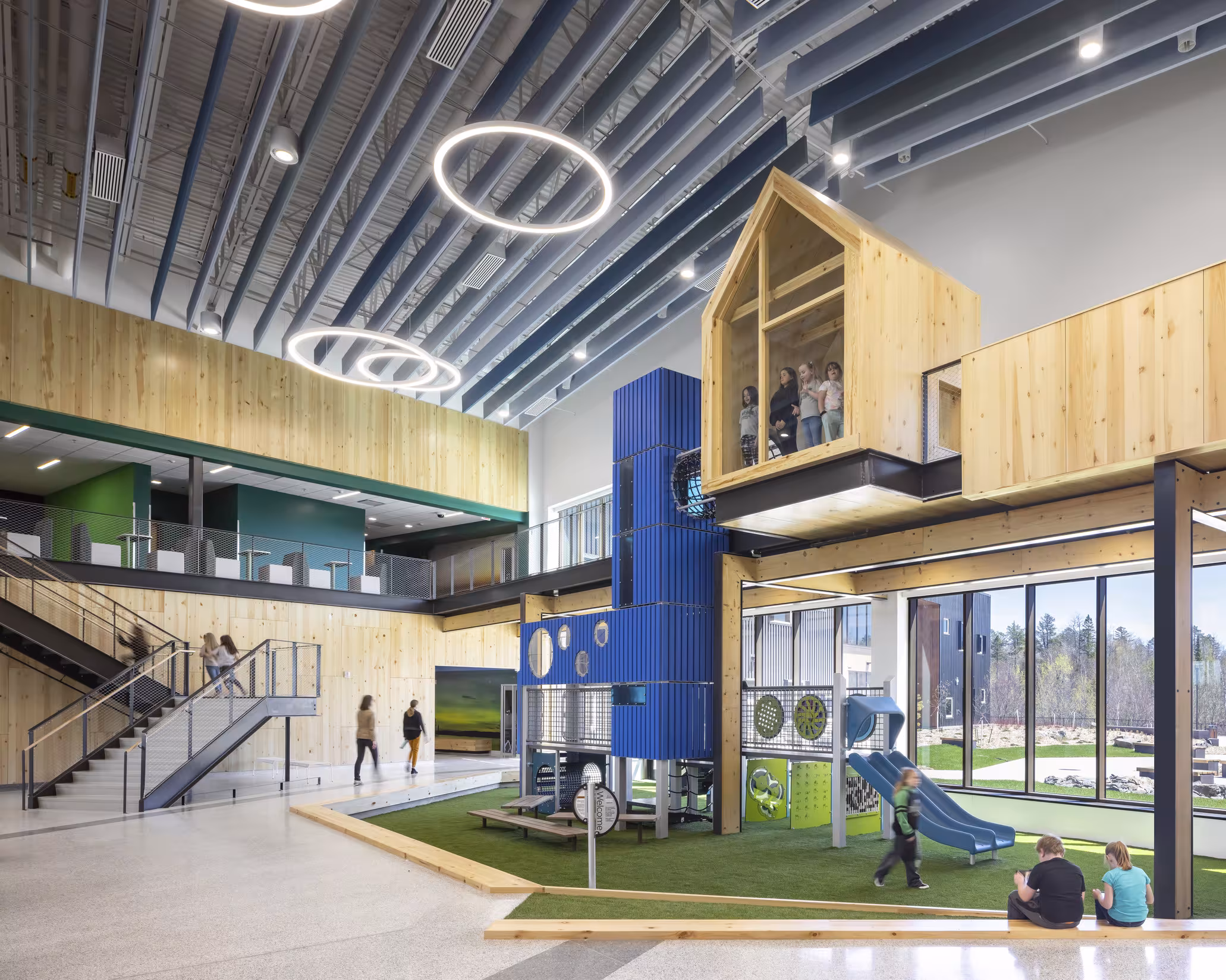 These neighborhoods are flexible, collaborative, and student focused. A unique, multi-story commons connects the learning neighborhoods and welcomes the community into the heart of the space. With breathtaking views of the surrounding forest, the commons connects users to the landscape and inspires play, both inside and outside.