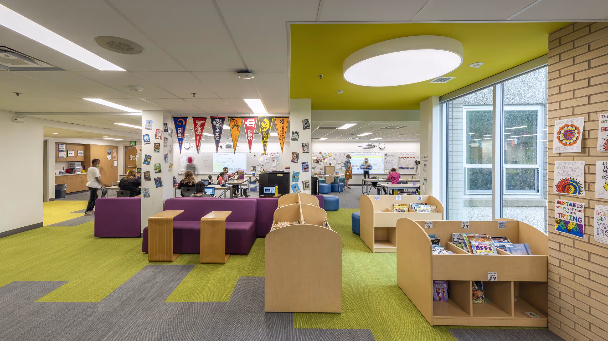 The school’s design adds a new cafeteria, preschool and kindergarten classrooms, learning studios for 3rd and 4th grades, a new playground relocated for greater safety and outdoor learning, and a relocated main entry to help alleviate previous busing and drop-off congestion.