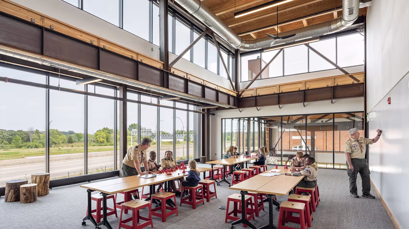 As a modern interpretation of the historic neighborhood, the design compliments the high-adventure programs carried out in the adjacent Base Camp building. Shared courtyards between the two buildings contain additional outdoor classrooms, gathering spaces, expanded ropes courses, climbing walls, and other physical challenges. The industrial interiors – wood steel, and concrete – showcase the wide entry commons, a double-height gathering hall anchored by a giant stone hearth, a special leadership lab, classrooms, scouting shop, offices and a breakroom for the staff.