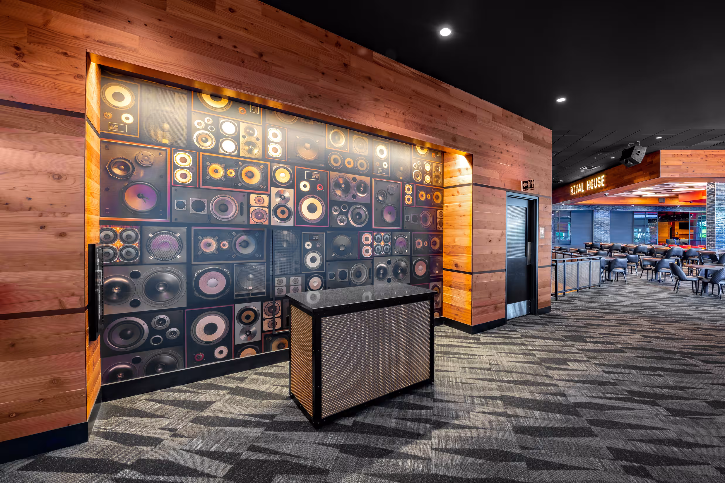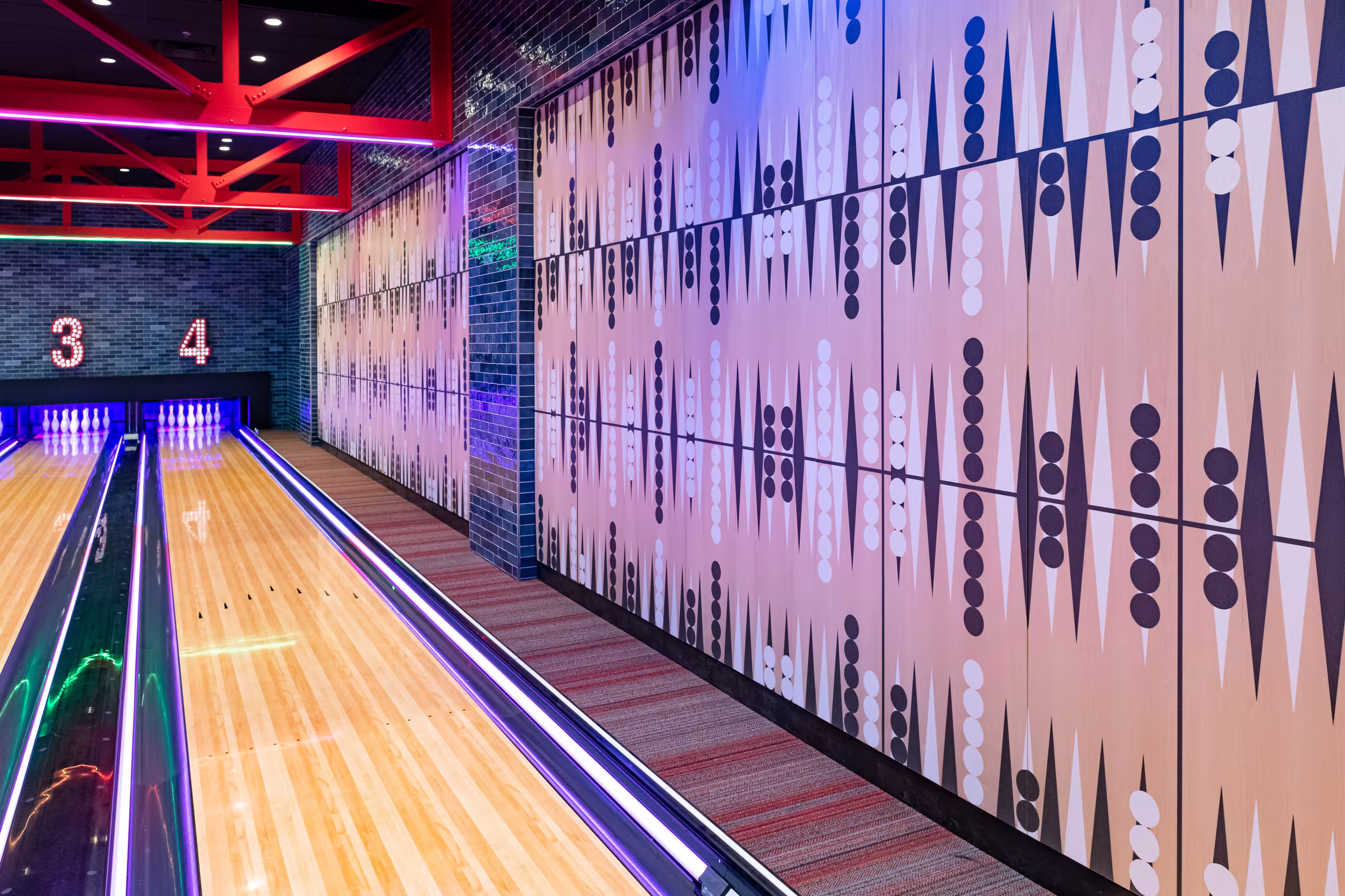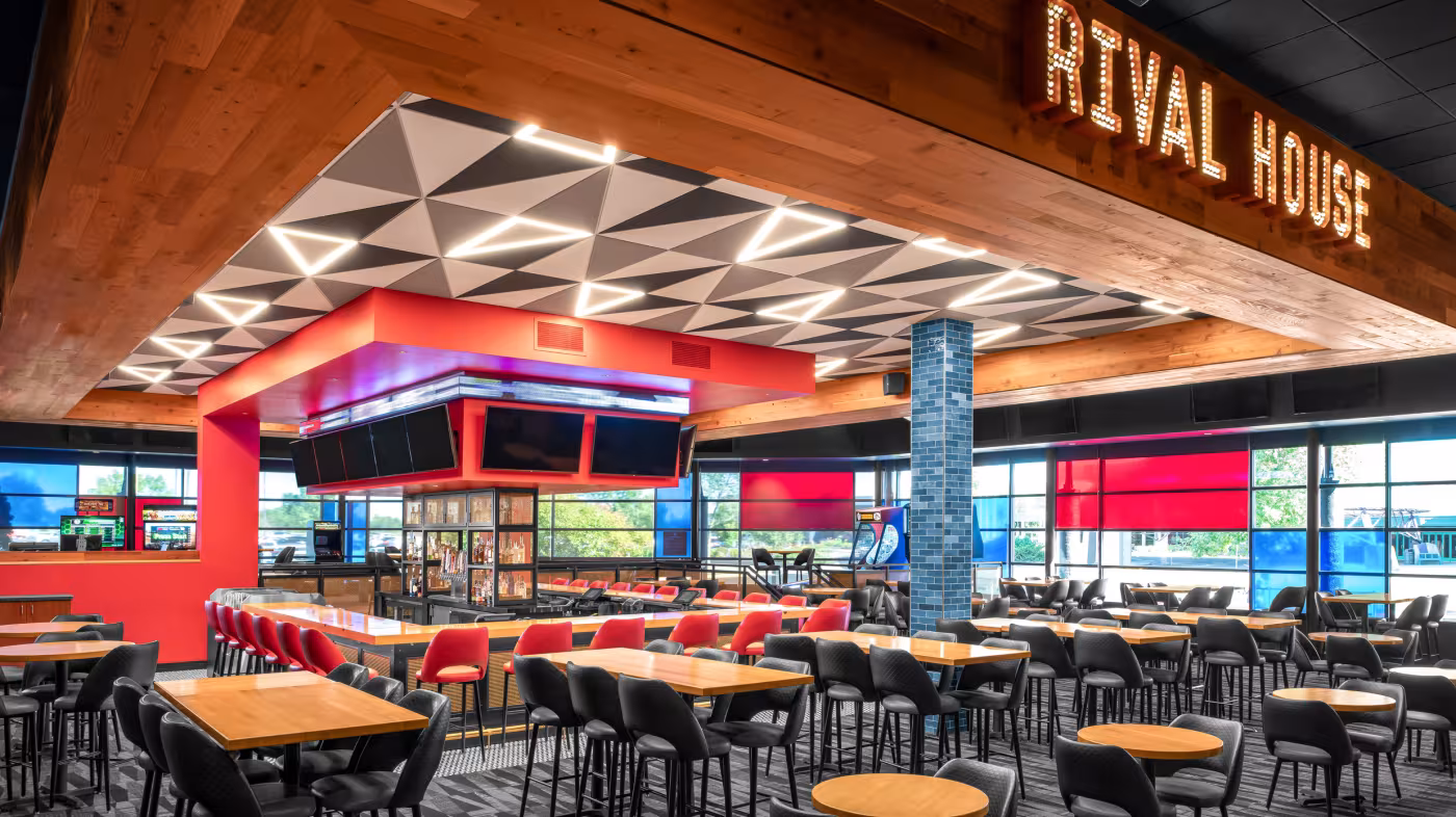 Rival House brings the high energy atmosphere of Grand Casino Hinckley into a stylish, smart, and whimsical entertainment venue. The restaurant takes design cues from the original Saint Paul location, but establishes its own unique sense of place. The design unites gaming, food, and music in a fully cohesive, hybrid entertainment experience. Rival House contains one of two hyper-bowling facilities in Minnesota, providing both a challenge and an opportunity to the design team to integrate innovative design strategies. Faux red beams above the bowling alley strategically contain hidden theatrical color-changing lights coordinated to the bowling games along with visually breaking up the space. Custom Backgammon acoustic wall panels line the adjacent wall to help prevent sound clashing from the stage and hyper-bowling facility. The end result is a restaurant that can comfortably host musical acts and gaming events simultaneously. Every material was deliberately chosen with “fun” in mind, from the ornate custom Parcheesi patterned floor tiles adorning the bathroom to the bold triangle ceiling tile with integrated lighting above the bar. Reclaimed wood warms up the venue stage walls while the wood bar top incorporates bowling pin markers for some added whimsy. Blue and red window film lends a sophisticated Mondrian quality to the exterior glass adding a distinguishing pop of color which will surely rival all other venues on property.