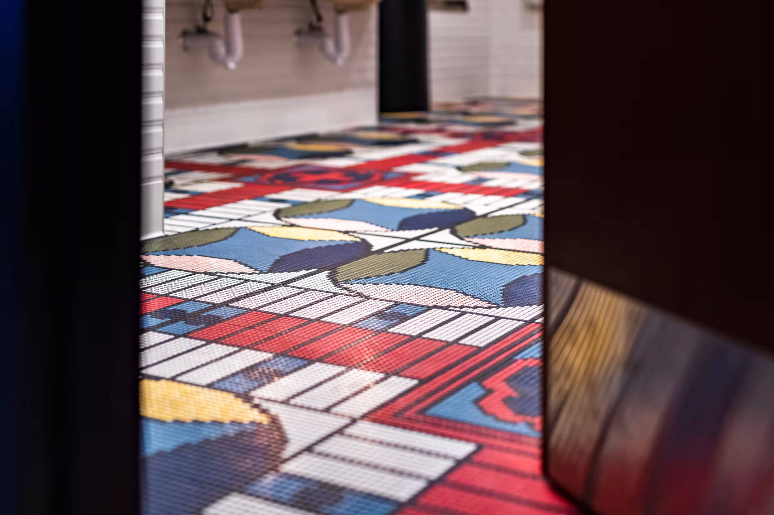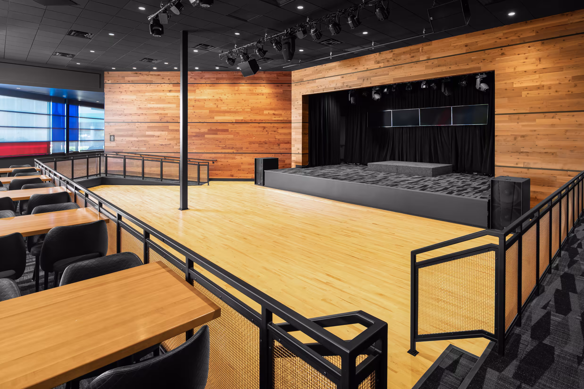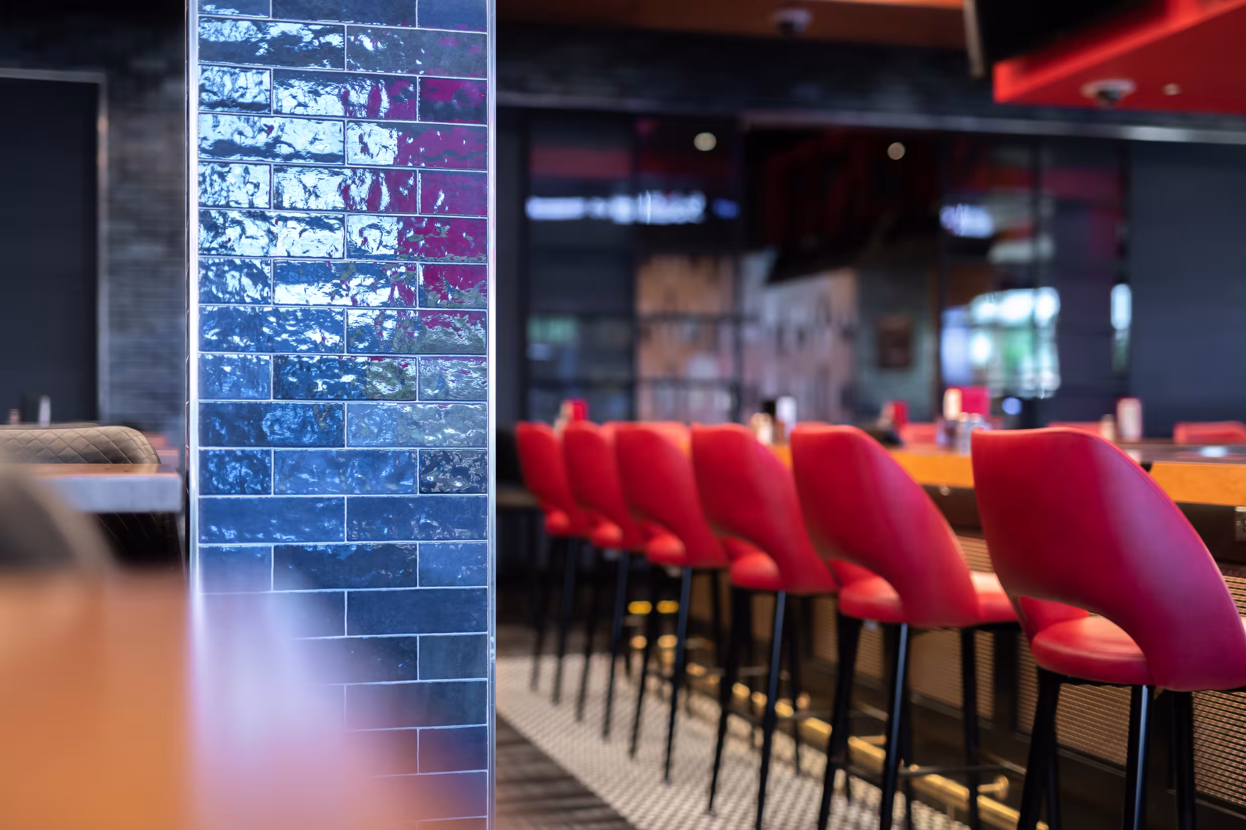 Rival House brings the high energy atmosphere of Grand Casino Hinckley into a stylish, smart, and whimsical entertainment venue. The restaurant takes design cues from the original Saint Paul location, but establishes its own unique sense of place. The design unites gaming, food, and music in a fully cohesive, hybrid entertainment experience. Rival House contains one of two hyper-bowling facilities in Minnesota, providing both a challenge and an opportunity to the design team to integrate innovative design strategies. Faux red beams above the bowling alley strategically contain hidden theatrical color-changing lights coordinated to the bowling games along with visually breaking up the space. Custom Backgammon acoustic wall panels line the adjacent wall to help prevent sound clashing from the stage and hyper-bowling facility. The end result is a restaurant that can comfortably host musical acts and gaming events simultaneously. Every material was deliberately chosen with “fun” in mind, from the ornate custom Parcheesi patterned floor tiles adorning the bathroom to the bold triangle ceiling tile with integrated lighting above the bar. Reclaimed wood warms up the venue stage walls while the wood bar top incorporates bowling pin markers for some added whimsy. Blue and red window film lends a sophisticated Mondrian quality to the exterior glass adding a distinguishing pop of color which will surely rival all other venues on property.