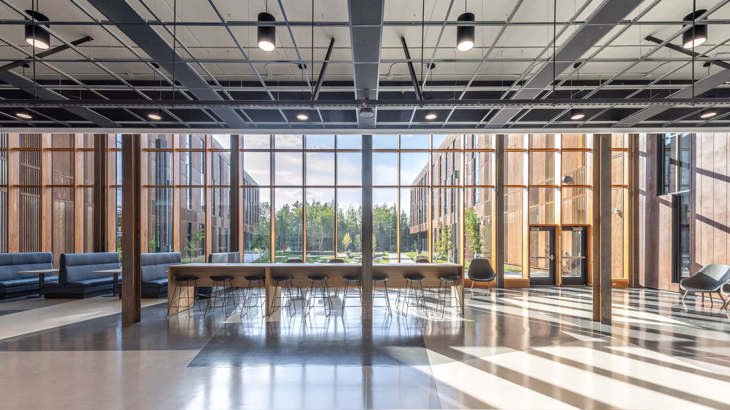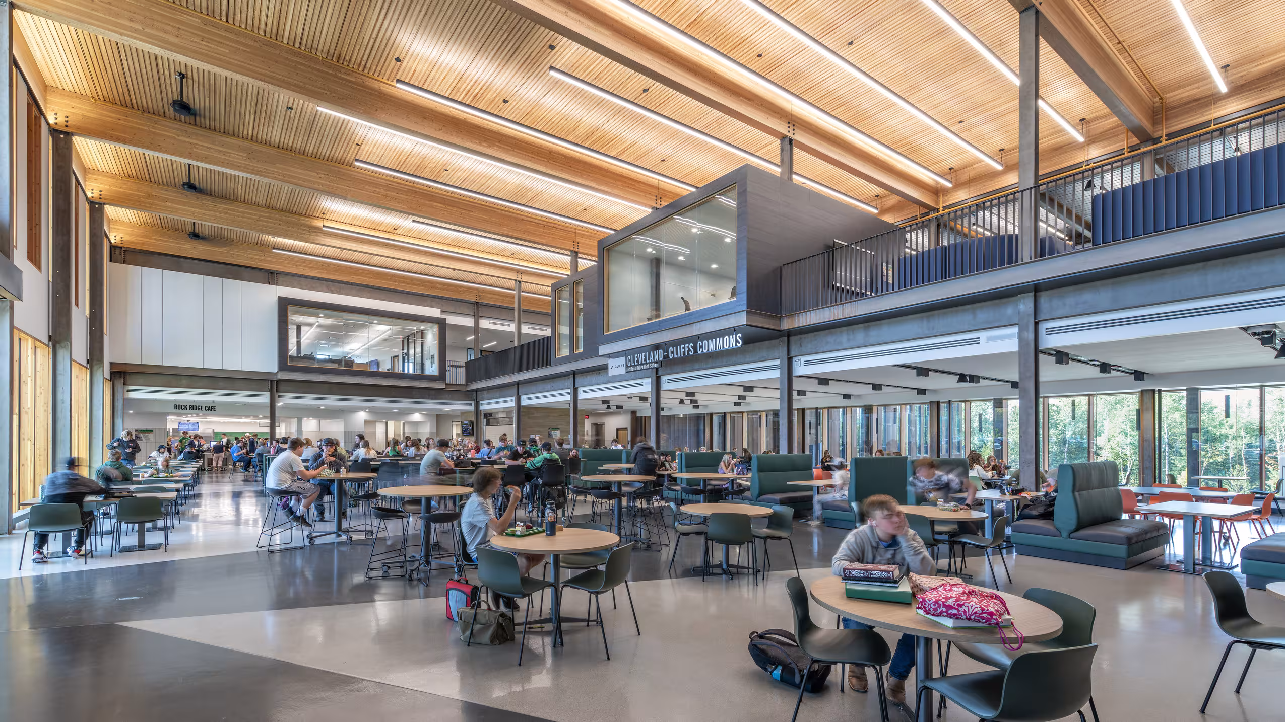 At the center of school life, a multi-story Innovation Commons connects all three building levels, establishing an open, cohesive atmosphere. This daylight-filled, flexible space anchors the school’s educational programming, supporting interdisciplinary learning, real-world project work, and student agency. It connects directly to a series of specialized labs and studios for manufacturing, robotics, culinary arts, and video production, providing students with authentic learning environments that mirror local workforce needs.