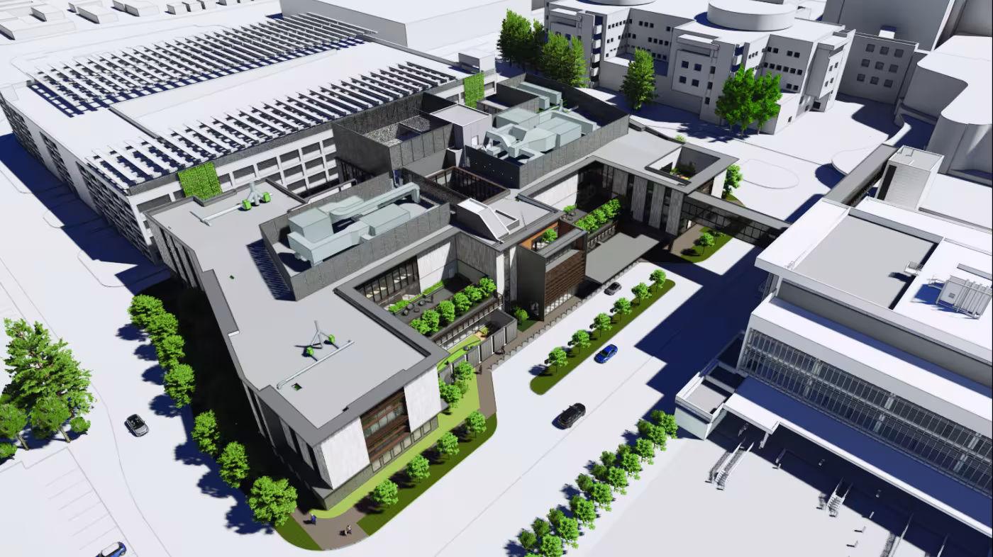A tunnel connecting the basement to the existing receiving building and sky-bridge connecting to the third level of the main hospital are also included.