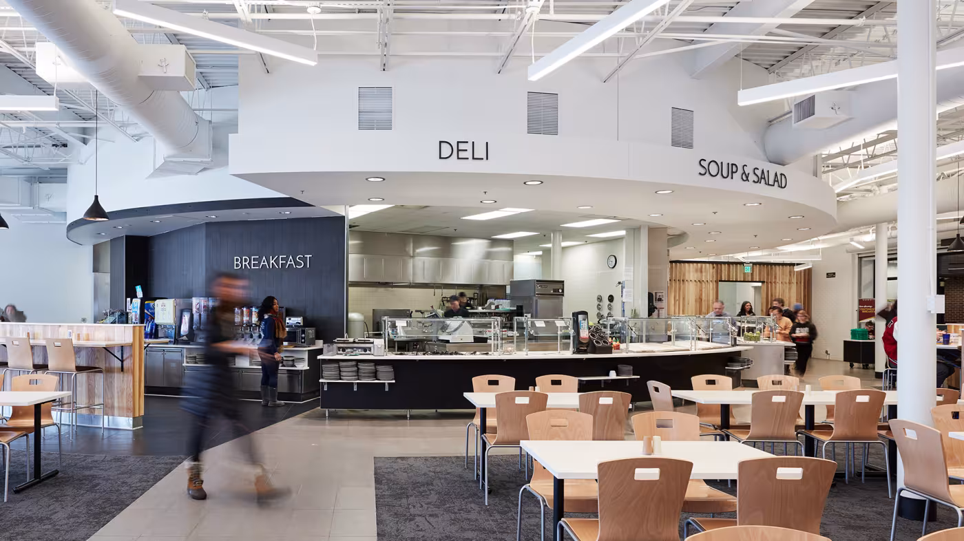 Sanford Dining Hall originally featured curved, continuous counters and walls that blocked views to the south windows of the dining hall, reducing daylight and overall visibility throughout. The design concept for the remodel sought to open up the space, capitalizing on the available daylight and views.