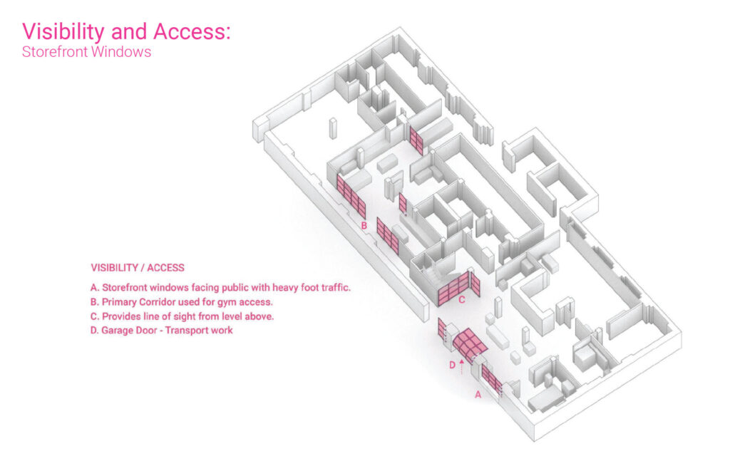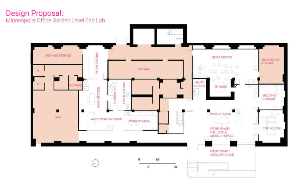 Using this background knowledge, Campo conducted interviews with five design firms from across the country with well-established fabrication labs/makerspaces. After learning how others were successfully leveraging their prototyping equipment, Campo generated a design proposal for how our Minneapolis office could elevate its model shop and, subsequently, the entire garden-level in which the model shop is located (see below graphics).
